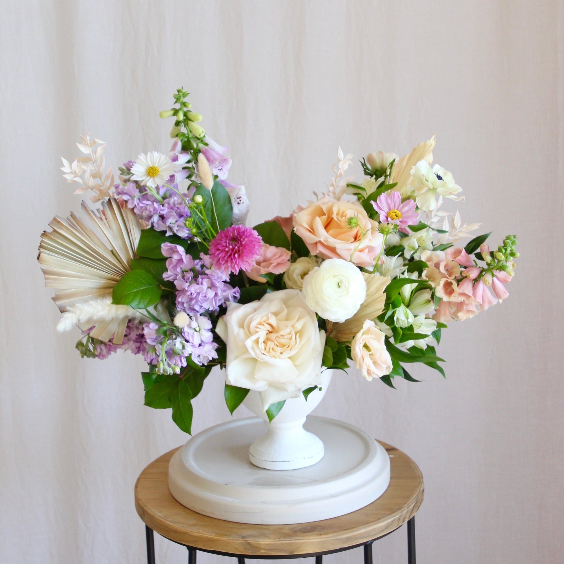Large statement centerpiece sized arrangement full of seasonal blooms designed in a unique vessel.