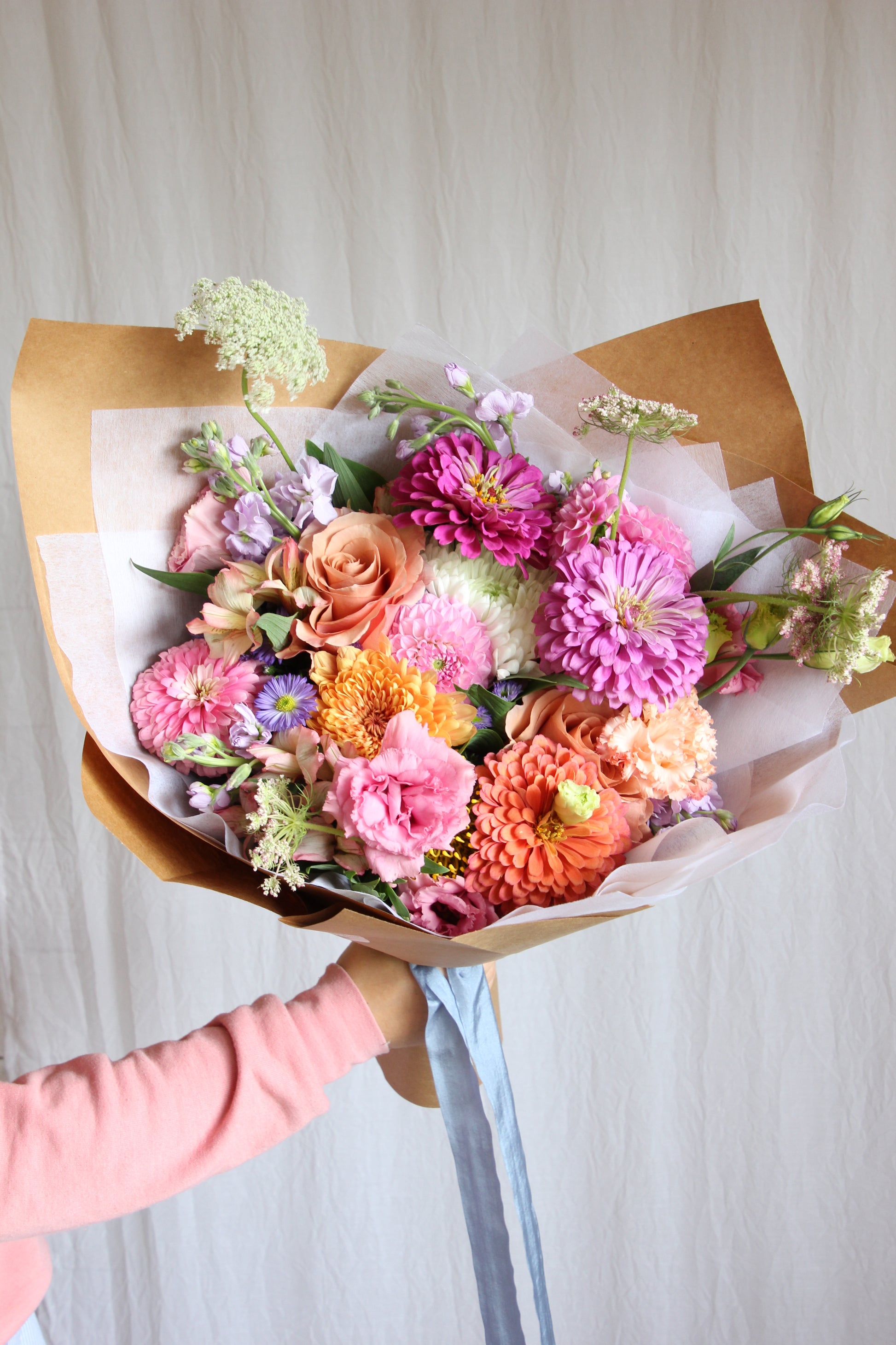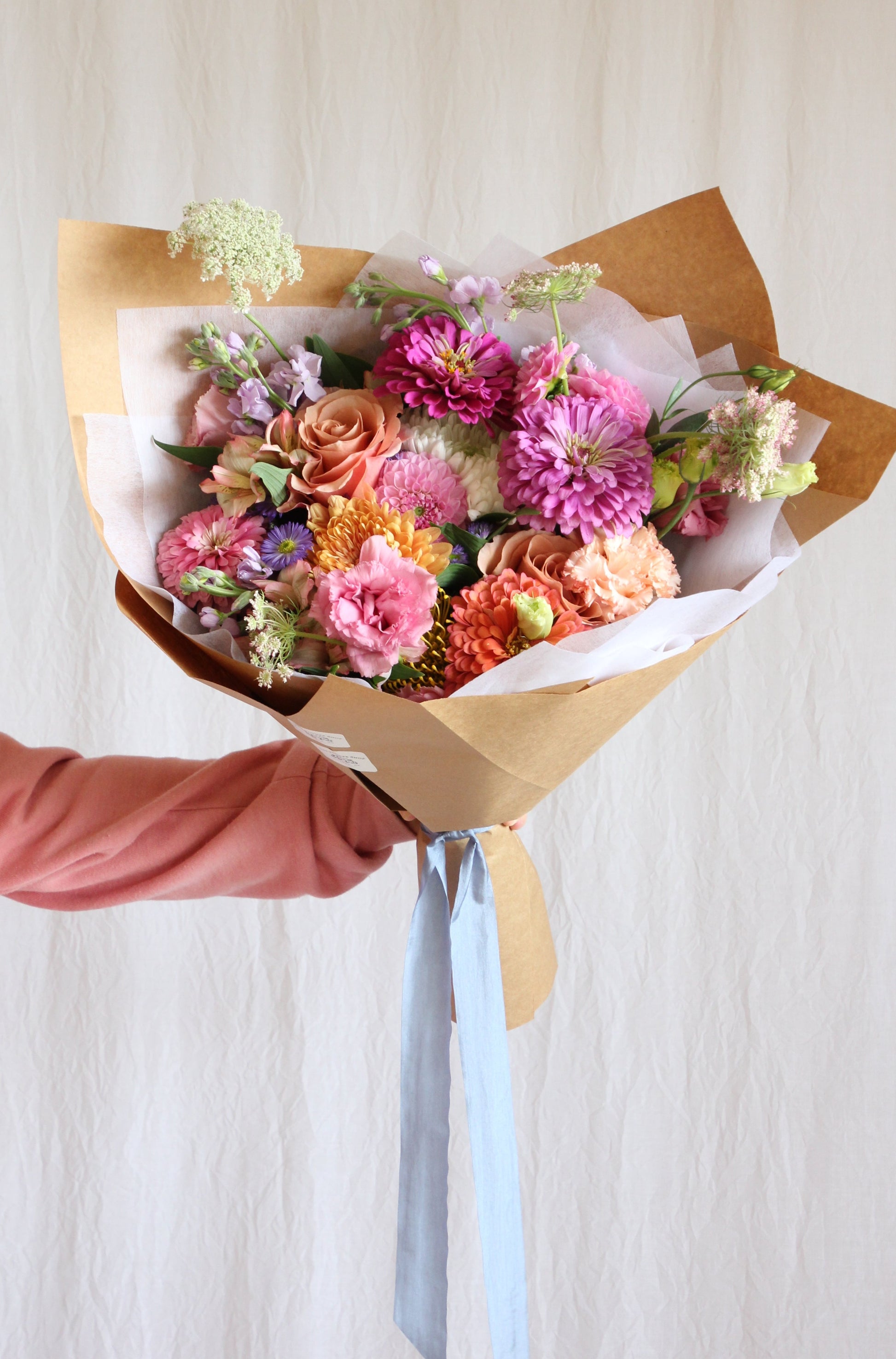 Pre-arranged seasonal blooms wrapped in brown paper with a ribbon. Great for someone who has a million vases or for those who love to arrange flowers for themselves! All you have to do is unwrap the bouquet and place it into a vase!
