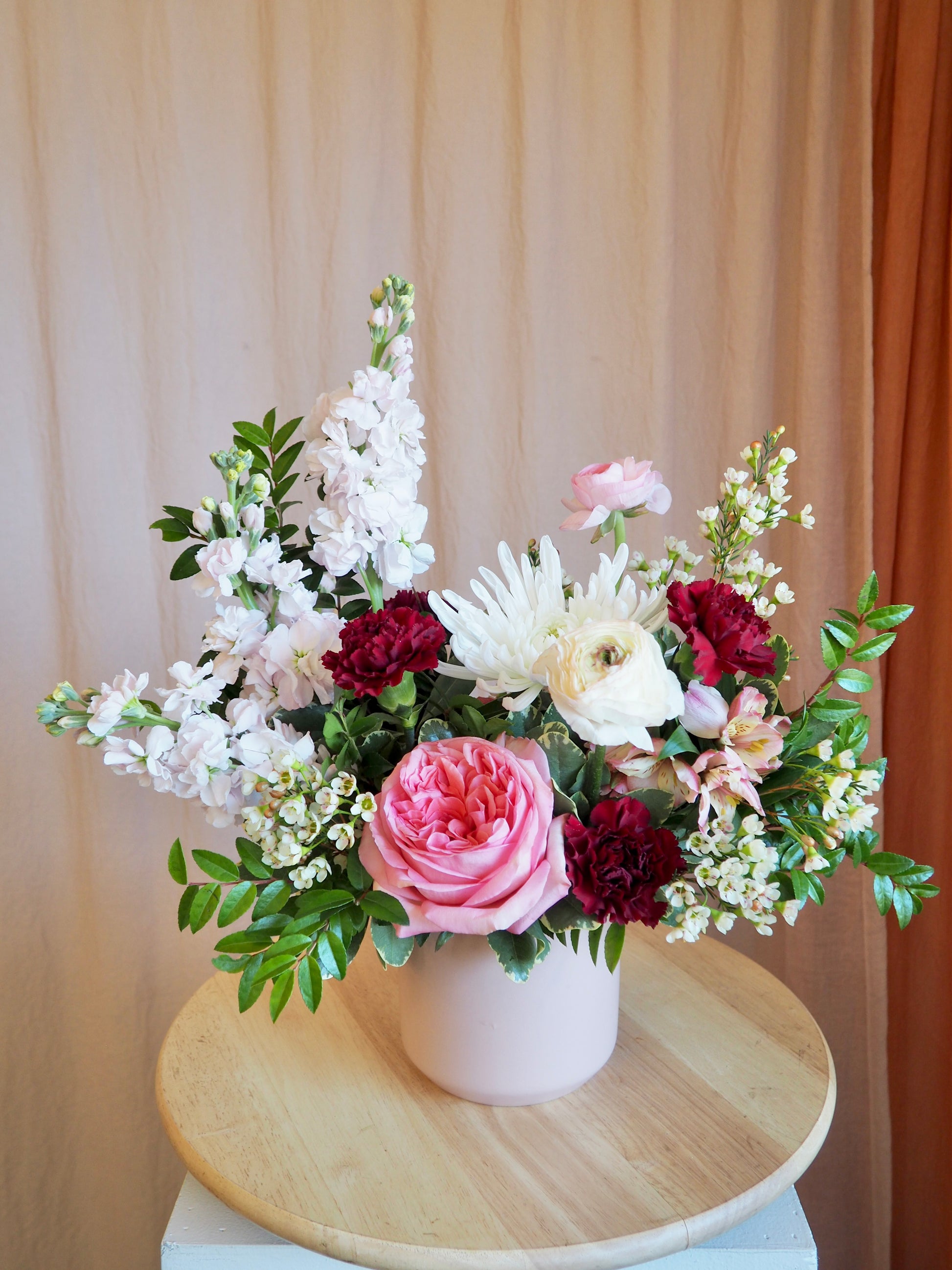 The arrangement will not look exactly like this image, but will be made to have a similar, asymmetrical, airy style. Exact flower availability is all based on what is currently in season.