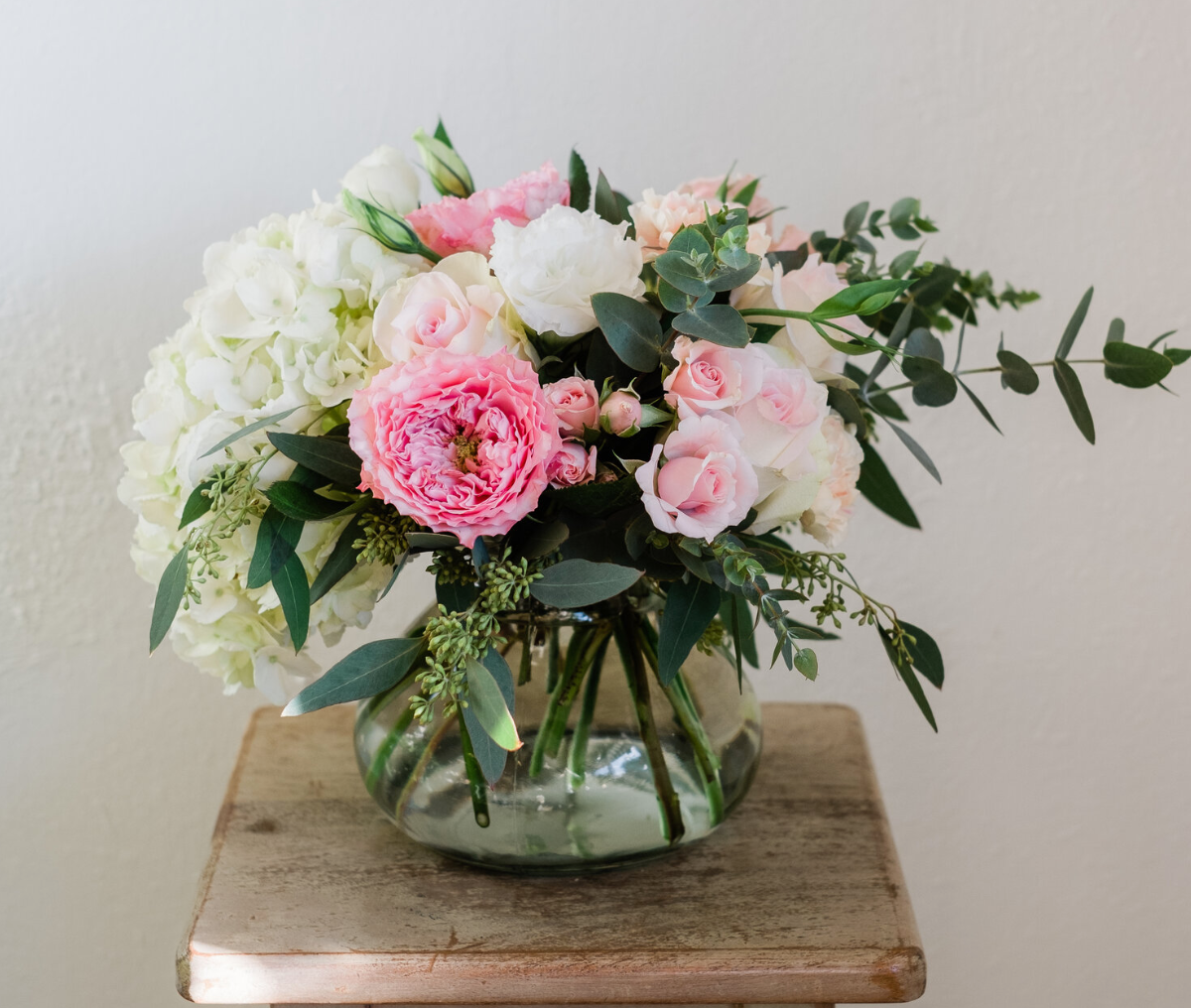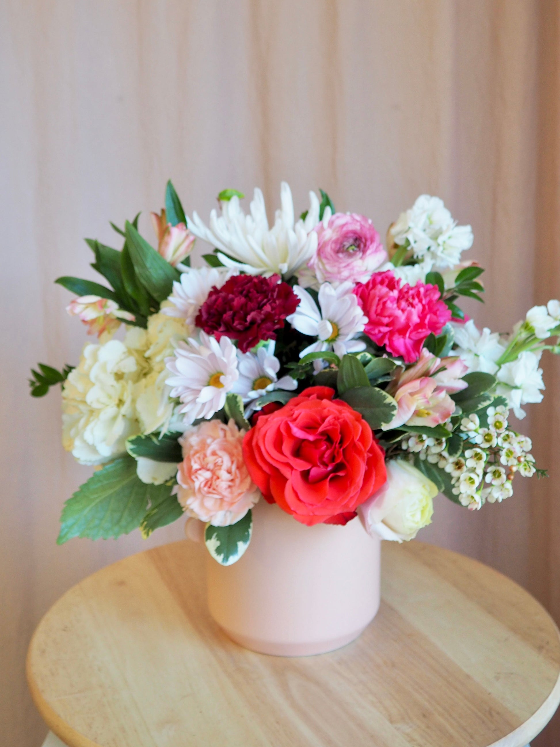 Medium arrangement full of seasonal blooms designed in a unique vessel.