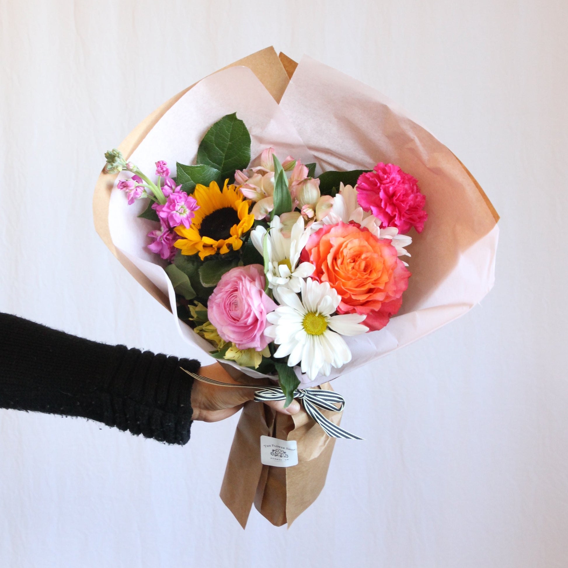 Pre-arranged seasonal Blooms wrapped in brown paper and ribbon. Perfect for the person who has too many vases, someone who wants to arrange themselves, or just as a lovely presentation! All you have to do is unwrap the bouquet and place into a vase.