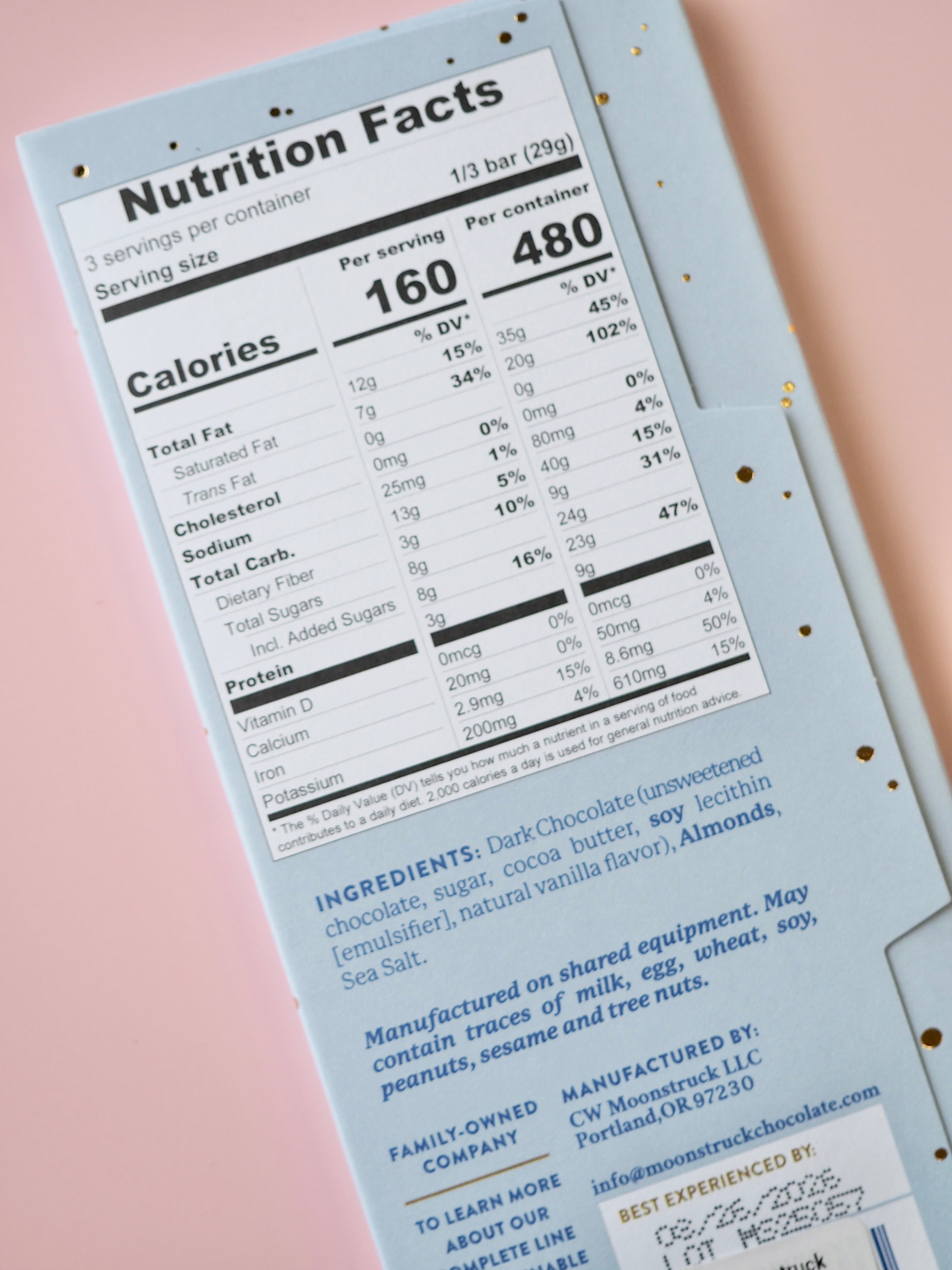 Artisan chocolate by Moonstruck - a Portland Oregon company. This is a full size chocolate bar containing a salty dark chocolate and almond blend.