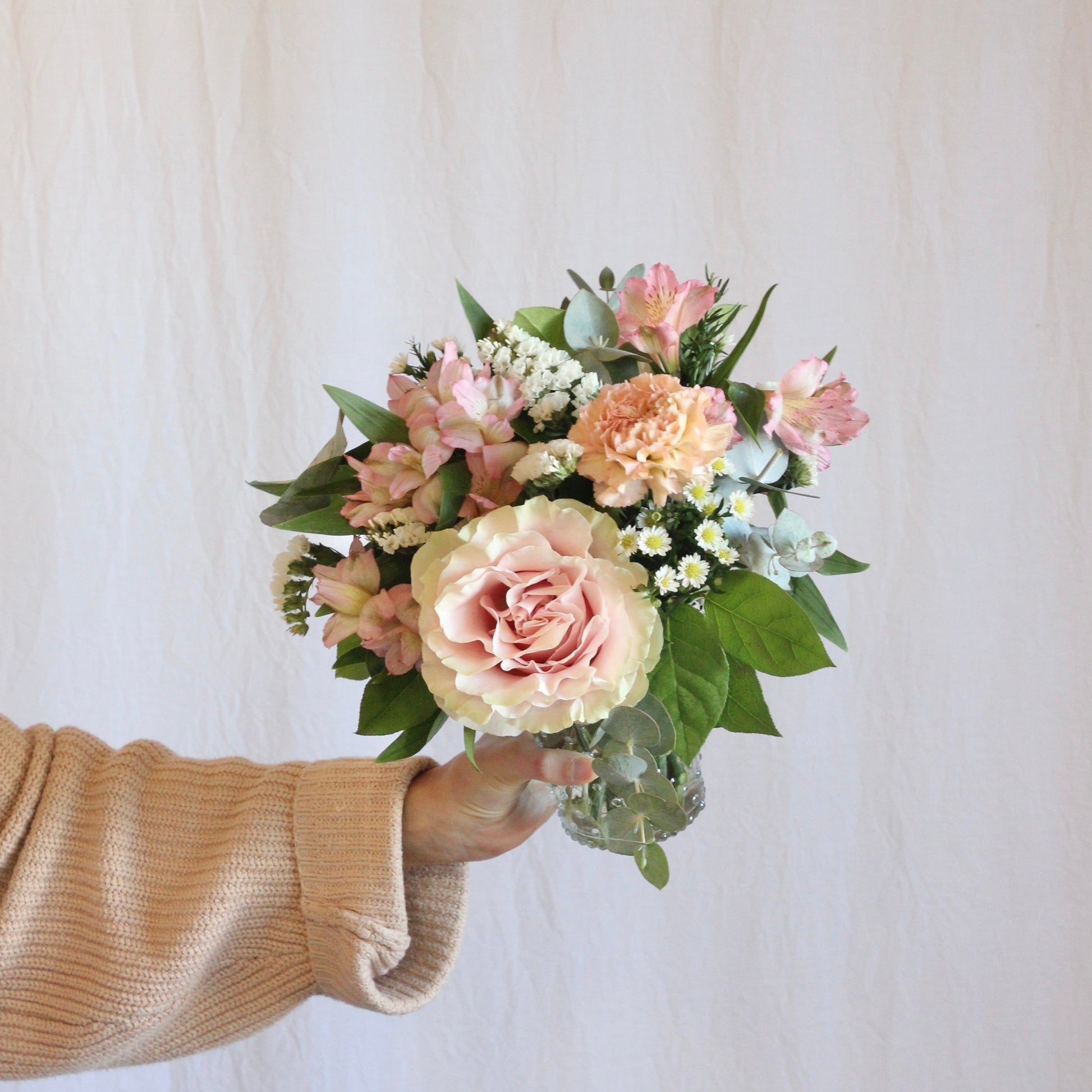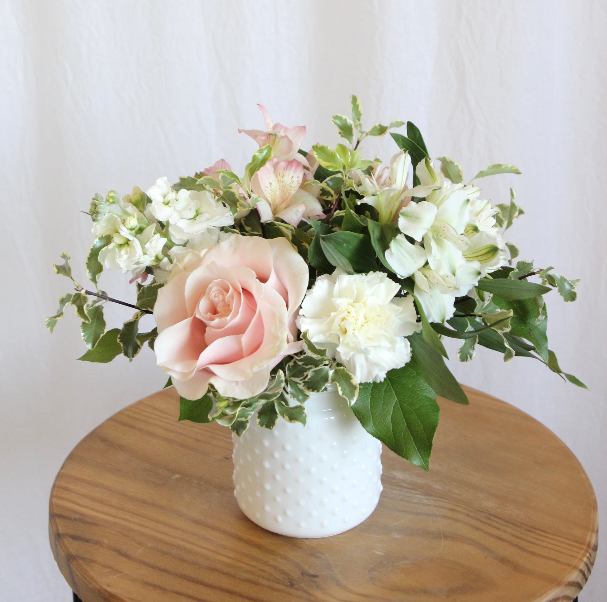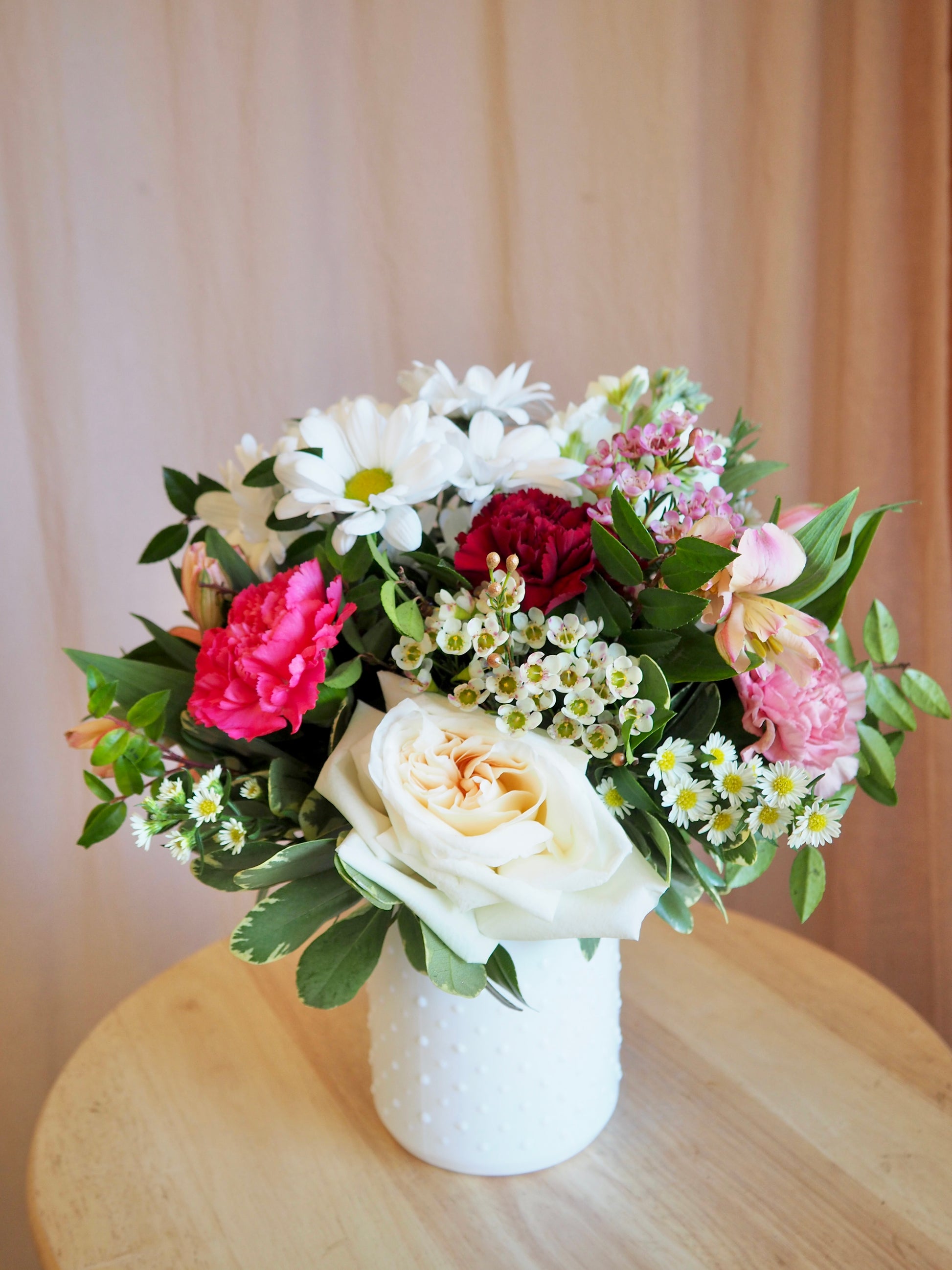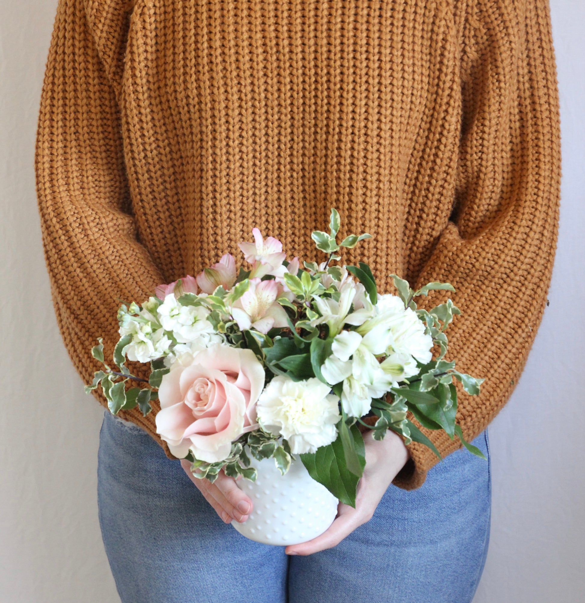Small, desk-top arrangement full of seasonal blooms designed in a unique vessel.