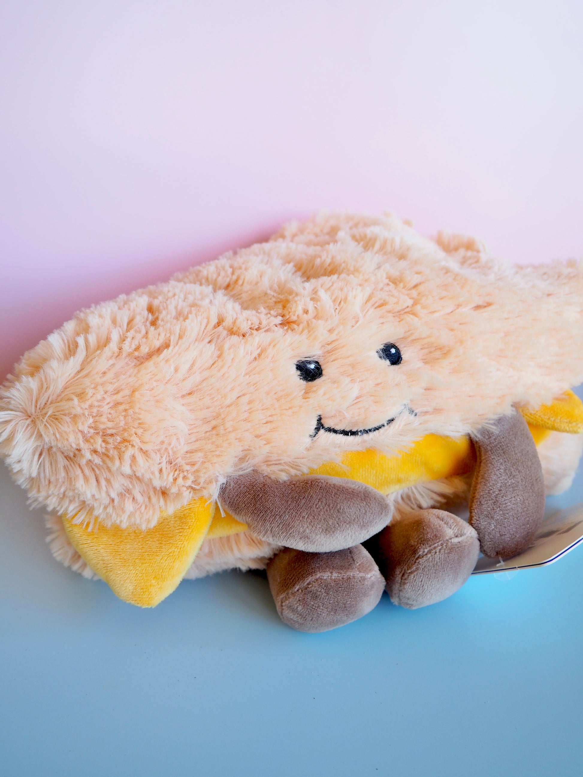 Stuffed grilled cheese from the brand Warmies! Super cute, can be warmed up in the microwave, and has a light lavender scent! Instructions on tag.